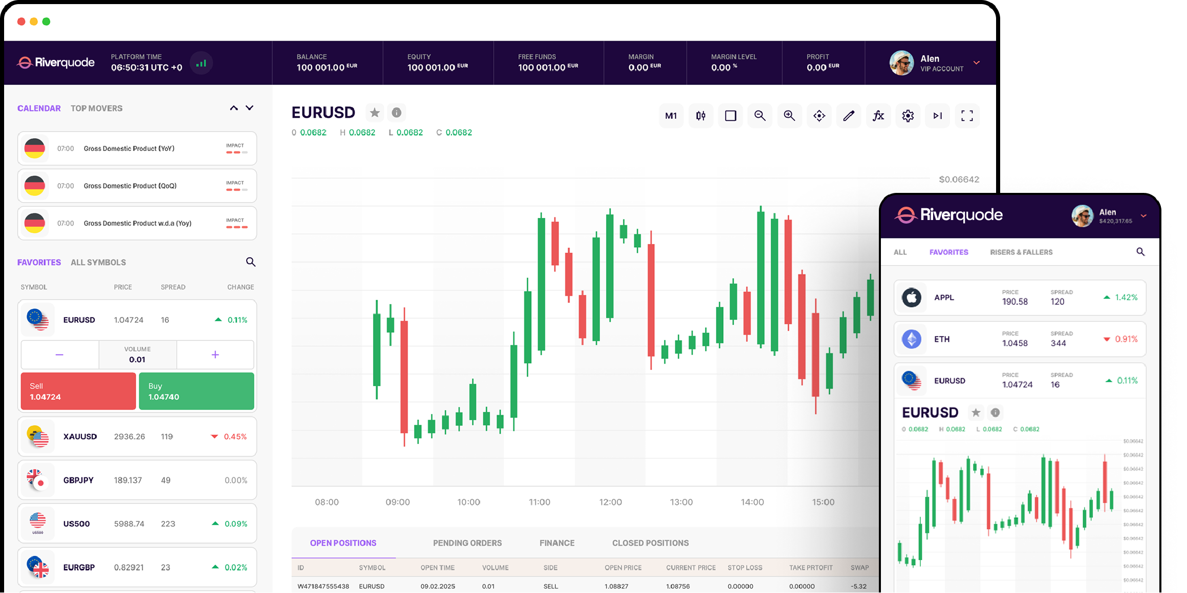 Riverquode ให้คุณเข้าถึงตราสารการซื้อขายที่หลากหลาย ทั้งหมดนี้อยู่ในแพลตฟอร์มที่ไร้รอยต่อพร้อมการเตือนและการแจ้งเตือนแบบเรียลไทม์